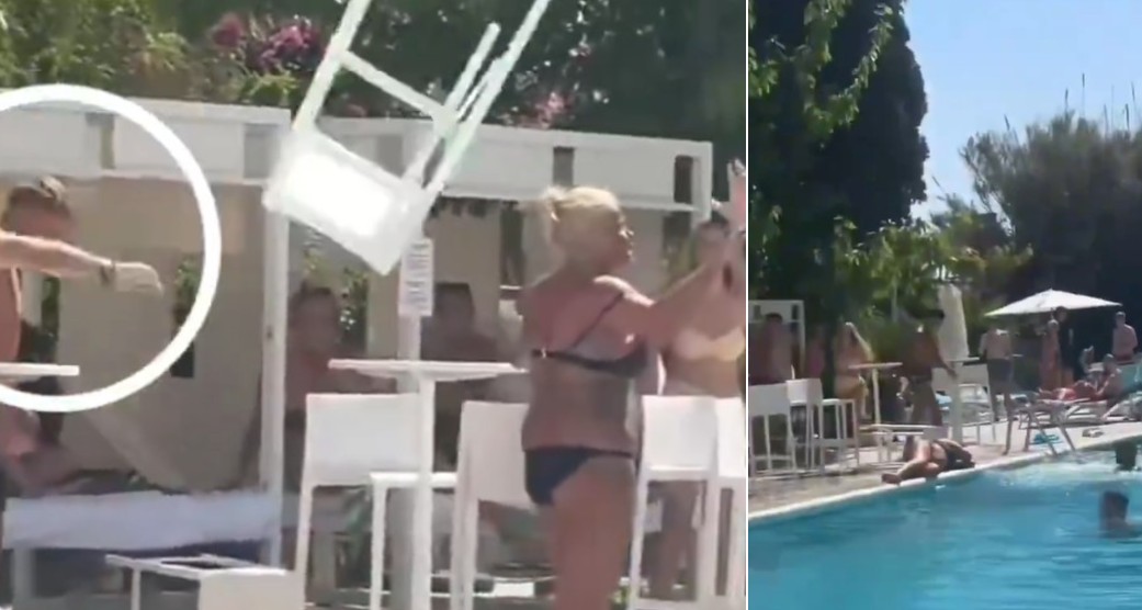 Shocking. Oldham Athletic striker Kian Harratt (circled) throwing a chair at a woman while on holiday… pic.twitter.com/ixemmXq7d9