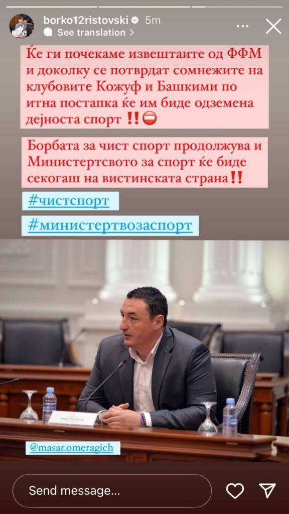 „Ќе ги почекаме извештаите од ФФМ и доколку се потврдат сомнежите, на фудбалските клубови Кожуф и Башкими по итна постапка ќе им биде одземена дејноста спорт“, изјави министерот Ристовски.