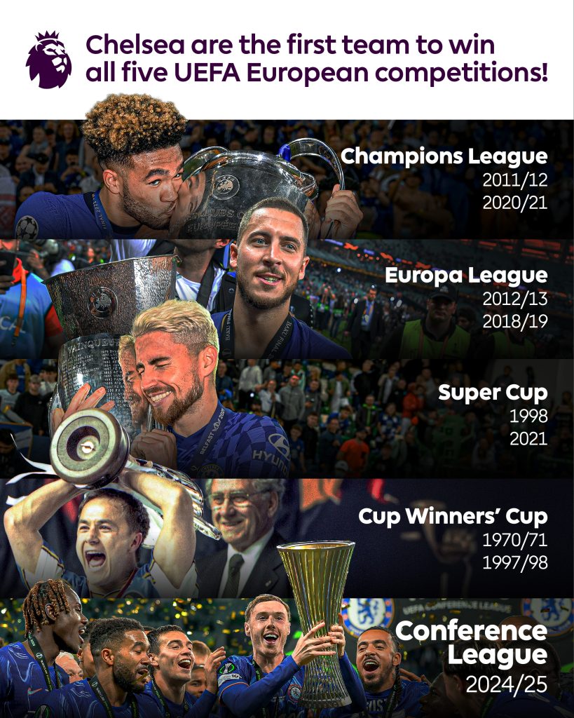 Тие ја освоија Лигата на шампионите, Лига Европа, Конференциската лига, Купот на победници на купови (натпреварување кое веќе одамна не постои) и Супер Купот.