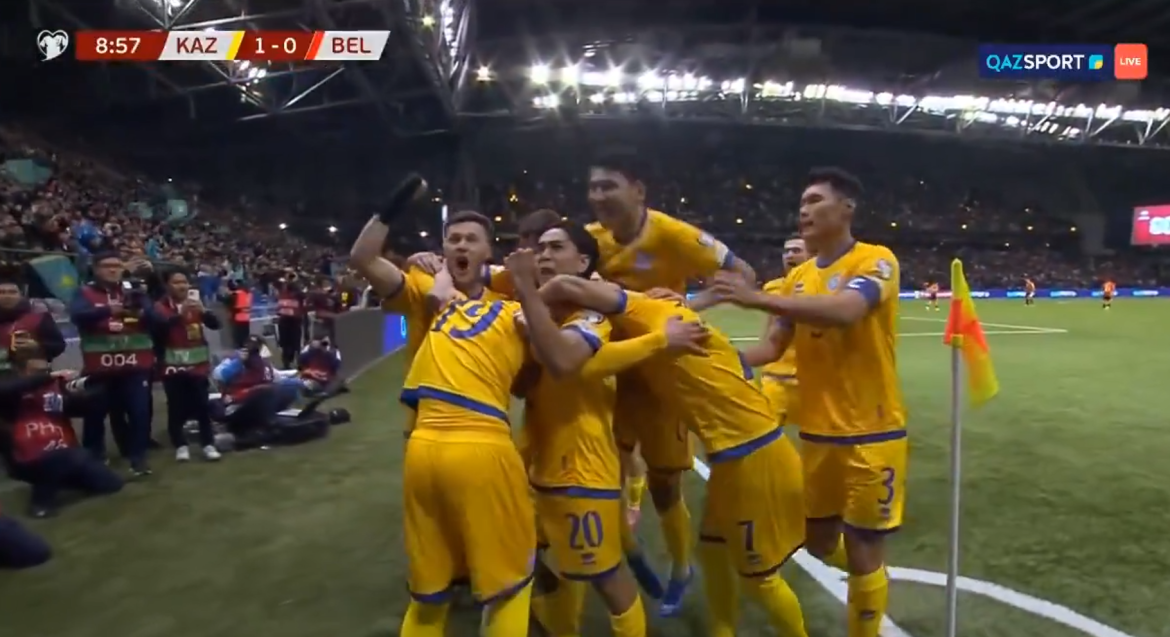 Казахстан приреди изненадување во Астана каде што по девет минути игра поведе против Белгија со голот на Дастан Сатпаев во квалификациската група Ј за пласман на СП 2026.