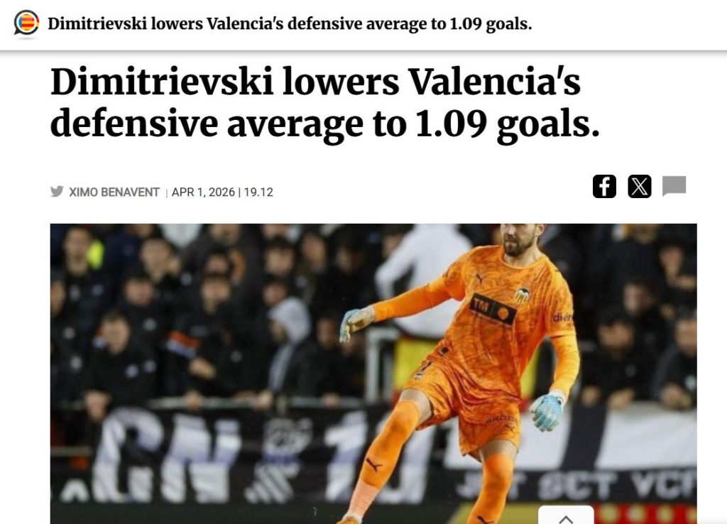 На 18 натпревари претходно, кога Димитриевски беше на клупата, Валенсија прими 30 голови или во просек 1,66 погодоци по меч. Со нашиот голман тимот има примено 12 голови на 11 меча.