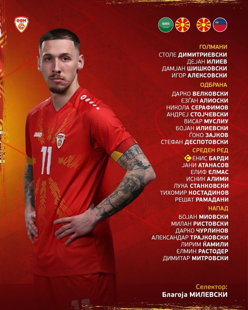 Селекторот Благоја Милевски денеска го објави списокот за натпреварите против Саудиска Арабија и Лихтенштајн, на него има двајца дебитанти.