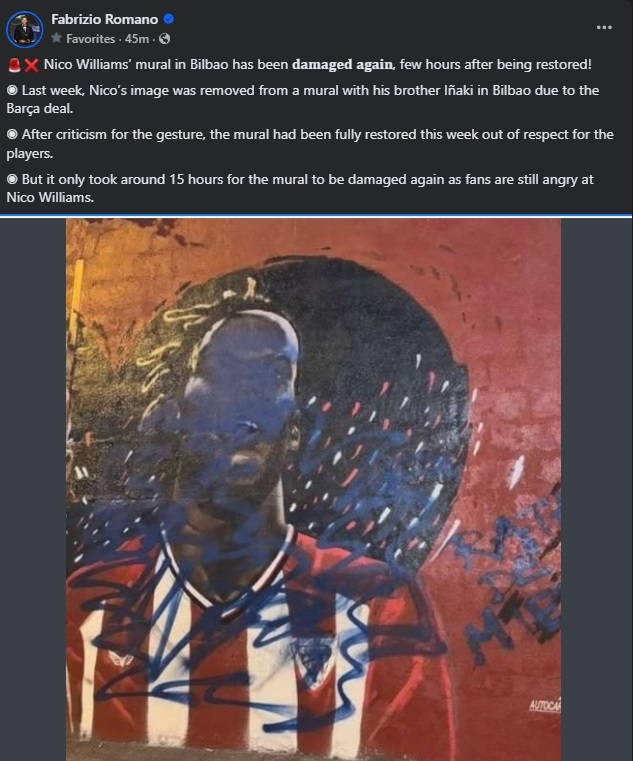 Навивачите го уништија муралот на Нико Вилијамс кој и претходно ја доживеа истата судбина, но беше обновен.
