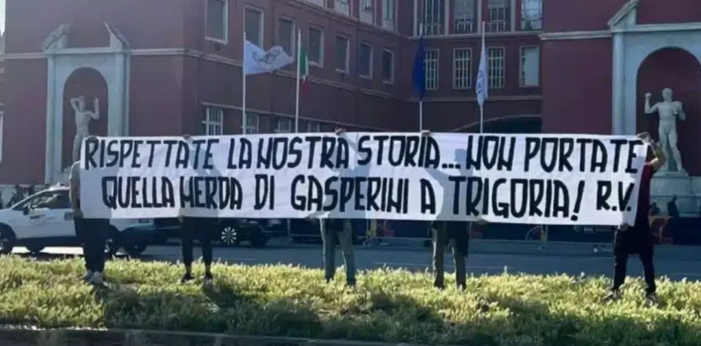Пред вчерашниот меч меѓу Рома и Милан, фановите на волчицата извадија банер на кој пишуваше: „Почитувајте ја нашата историја, не го носете тоа „го*но“ Гасперини во Тригорија“.