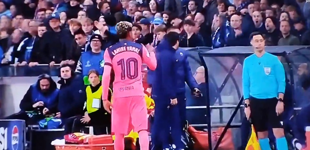 Lamine Yamal challenging a Bruges fan to come down onto the pitch.
