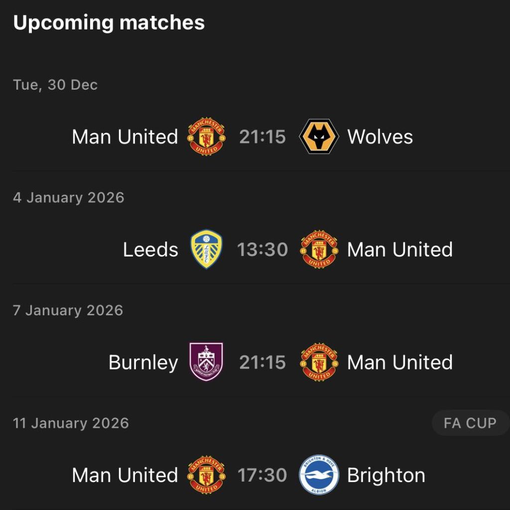 Во следното коло избраниците на Рубен Аморим ќе играат против Вулвс кој е последен на табелата со само два бода по 18 кола, потоа Лидс кој е 16-ти, па 19-тиот Барнли, додека на 11 јануари ги чека 12-тиот во Англија овој момент, Брајтон.