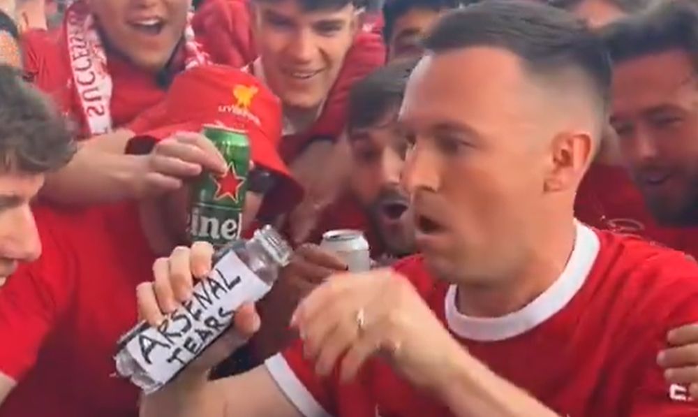 Фан на Ливерпул на шише со вода имаше напишано „Солзите на Арсенал“ и пиеше од тоа.