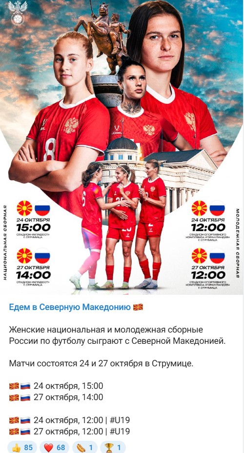 Женската фудбалска репрезентација на Македонија во октомври ќе одигра два контролни натпревара против Русија, а двата меча ќе се одржат на стадионот „Благој Истатов“ во Струмица.