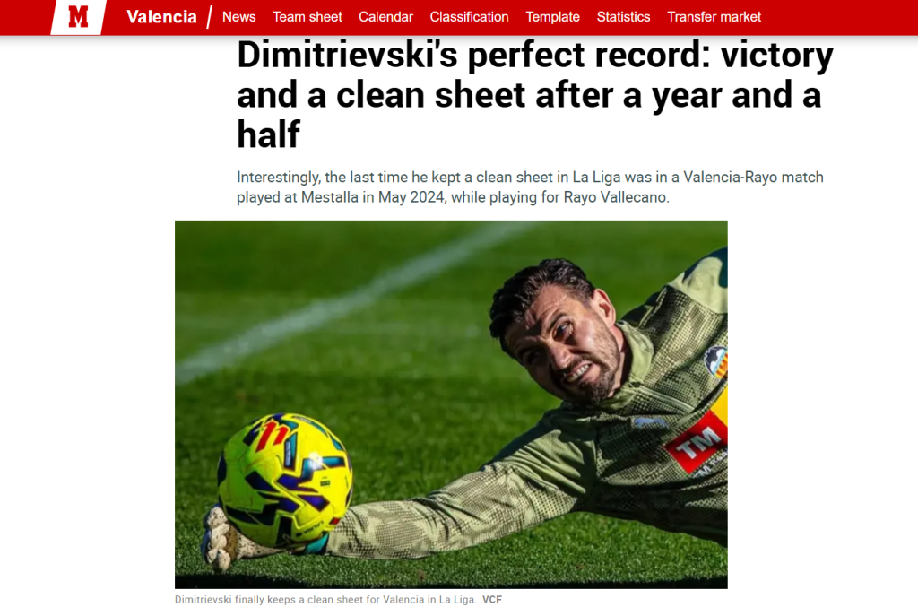 „Марка“ објави дека Димитриевски по година ипол конечно повторно ја сочувал мрежата во Ла Лига, но без да го нагласи фактот дека македонскиот голман оваа сезона имаше минимална минутажа во првенството.