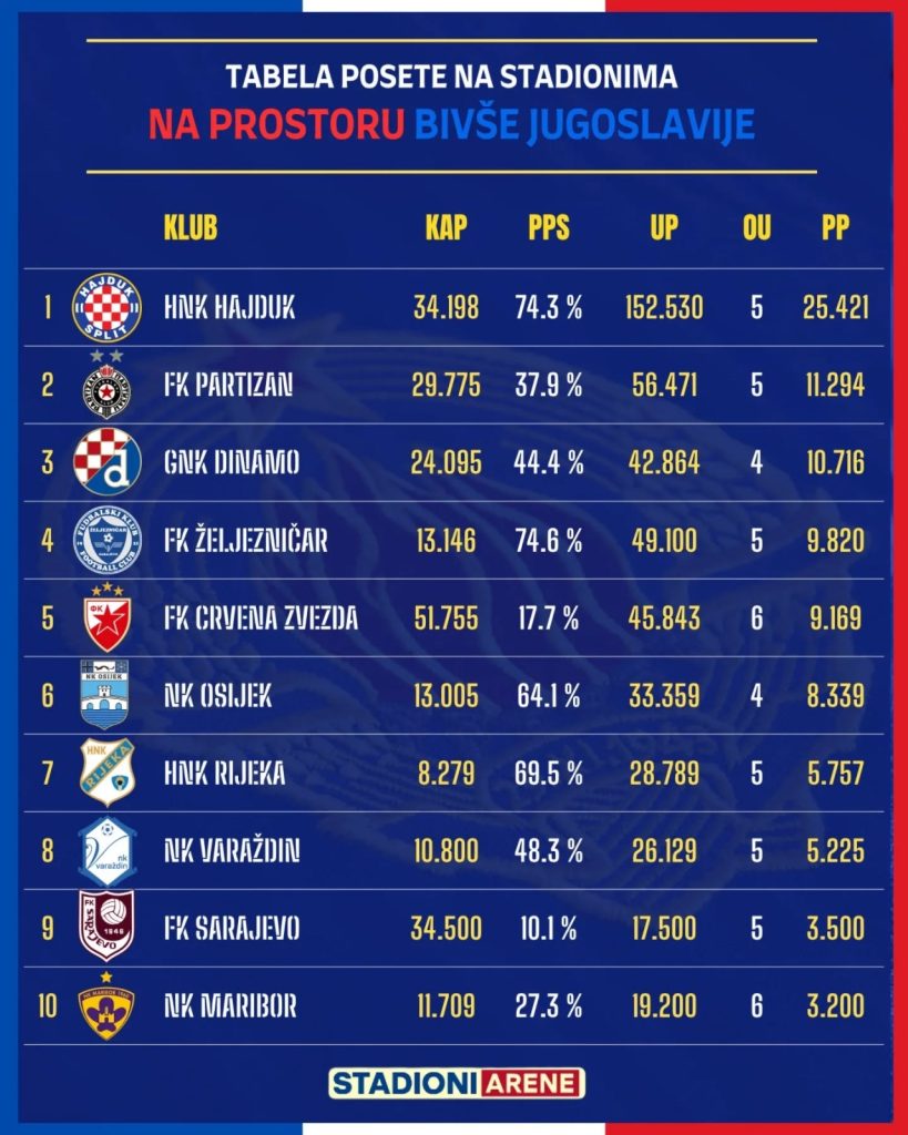 По првите кола од новата сезона направен е пресек за бројот на гледачи на натпреварите во првенствата од поранешна Југославија, Хајдук е убедливо најгледаниот клуб.