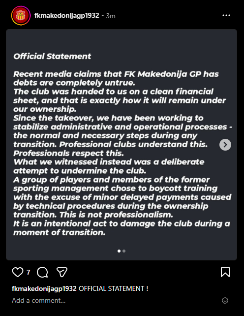 „Неодамнешните медиумски тврдења дека ФК Македонија ЃП има долгови се целосно невистинити. Клубот ни беше предаден со чиста финансиска состојба, и така ќе остане во иднина под наше раководство. Од преземањето наваму, работиме на стабилизирање на административните и оперативните процеси.
