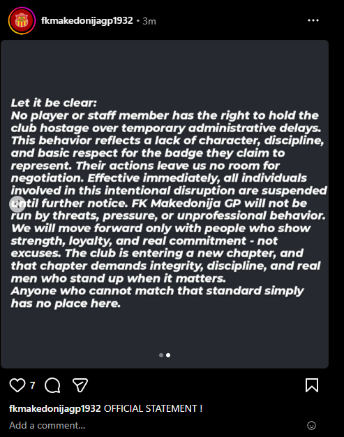 Со моментално дејство, сите лица вклучени во оваа намерна дестабилизација се суспендирани до понатамошно известување. ФК Македонија ЃП нема да се води со закани, притисоци или непрофесионално однесување. Ќе продолжиме само со луѓе кои покажуваат сила, лојалност и вистинска посветеност, а не изговори. Клубот влегува во ново поглавје, а тоа поглавје бара интегритет, дисциплина и вистински луѓе кои застануваат кога е најважно. Секој што не може да го исполни тој стандард, едноставно нема место тука“, се вели во соопштението.
