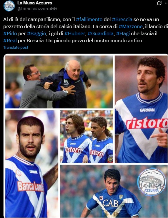 Еден од најпознатите клубови од Италија, Бреша, повеќе не постои. Финансиските проблеми кои долго време го притискаа клубот конечно кулминираа, рокот за исплата на долг од три милиони евра истече вчера попладне, а сопственикот Масимо Челино не успеа да ја обезбеди потребната документација за добивање на лиценца за настап во новата сезона.