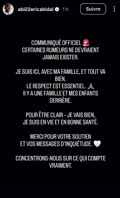„Некои гласини никогаш не треба да се појават. Тука сум, со моето семесто и во добро здравје, се е во ред. Зад мене е семејството и моите деца. Нека биде јасно, добро сум, жив и здрав. Ви благодарам на пораките за поддршка и загриженоста, сега да се фокусираме на нешто што навистина е важно“, објави Абидал.