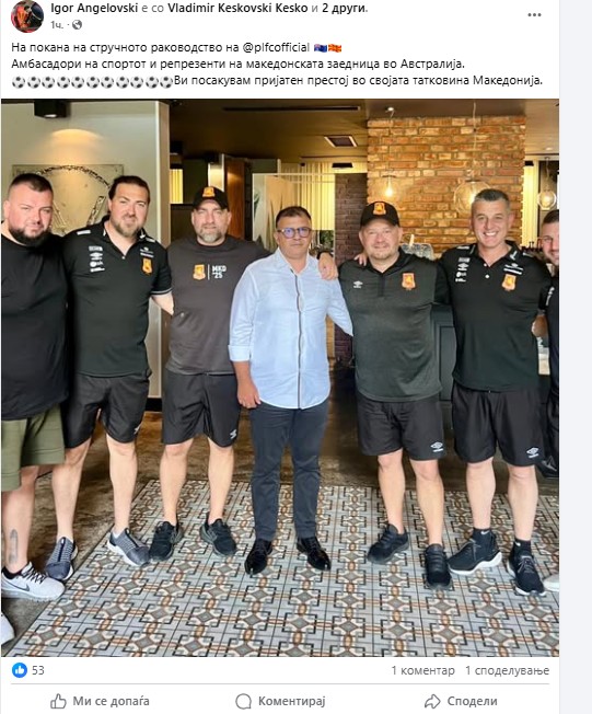 „На покана на стручното раководство на Престон Лајонс. Амбасадори на спортот и репрезенти на македонската заедница во Австралија. Ви посакувам пријатен престој во својата татковина Македонија“.