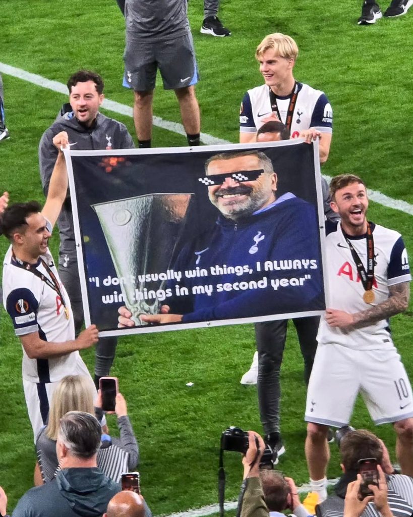 Дури и фудбалерите на Тотнем имаа банер со изјавата на Постекоглу, па го извадија за време на славјето на трофејот.