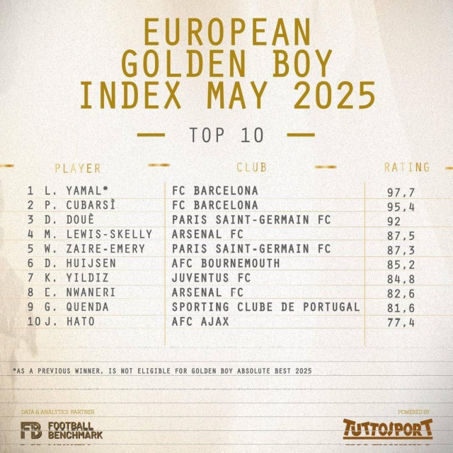 На самиот врв се наоѓа Ламин Јамал, но со оглед на тоа што младиот бисер на каталонскиот гигант веќе ја освои наградата минатата година, оваа сезона не влегува во конкуренција. Тоа ја отвора вратата за неговиот соиграч, Пау Кубарси, кој веќе важи за главен фаворит.