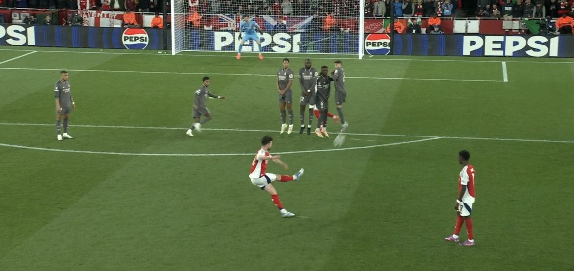 Арсенал од 58. минута води со 1-0 против Реал Мадрид благодарение на спектакуларен погодок на Деклан Рајс од слободен удар.