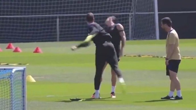 Војчех Шчесни и Роберт Левандовски приредија мало шоу на последниот тренинг на Барселона, голманот и напаѓачот покажаа дека одлично можат да се снајдат и во актерските води, па исценираа тепачка.