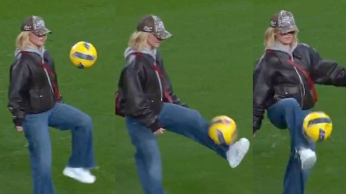 Американката го украде шоуто откако по последниот свиреж се симна долу на теренот и покажа дека има фудбалски вештини.