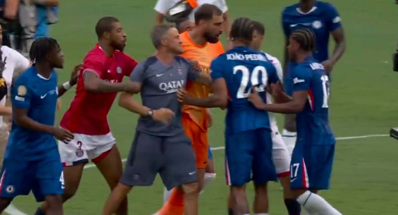 Пред Луис Енрике да влезе во инцидентот, тоа беше само вербален дуел меѓу фудбалери на Челси и ПСЖ, но шпанскиот стратег реши да се справува и на физички начин, па го удри Жоао Педро кој падна на тревата.