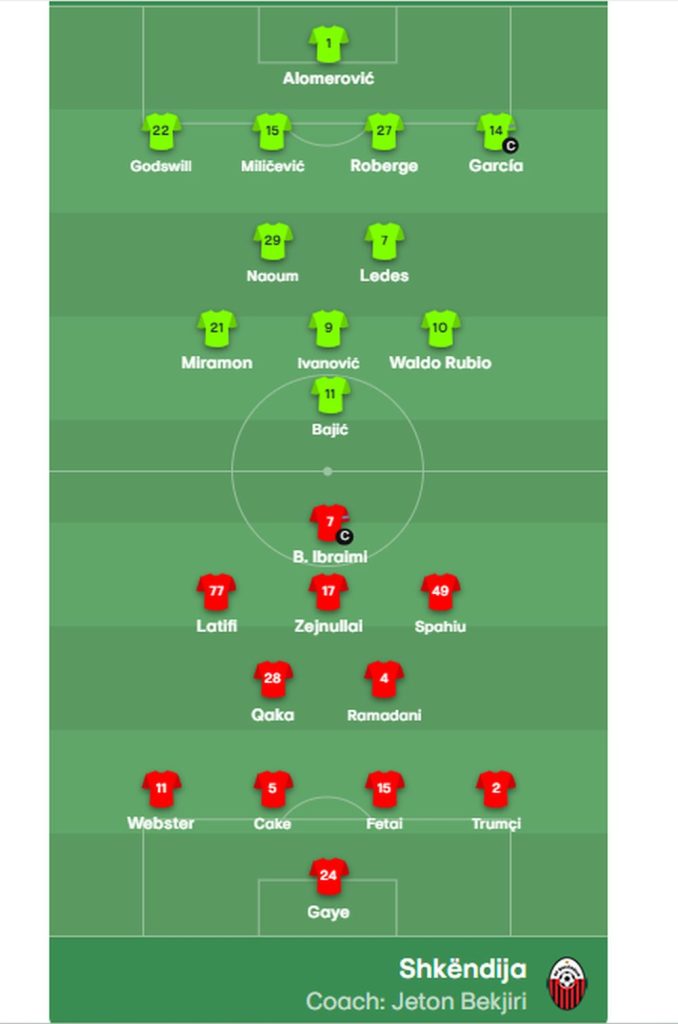 Стартниот состав на Шкендија е: Гаје, Трумчи, Фетаи, Цаке, Вебстер, Рамадани, Ќака, Љатифи, Зејнулаи, Спахиу и Ибраими.