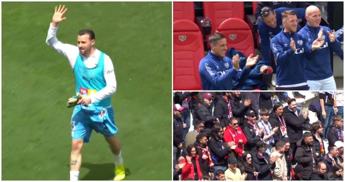 El reconocimiento de afición y jugadores del @RayoVallecano a Dimitrievski, portero con más partidos de la historia rayista ⚡#LALIGAenDAZN ⚽ pic.twitter.com/g9AbdTyMxk