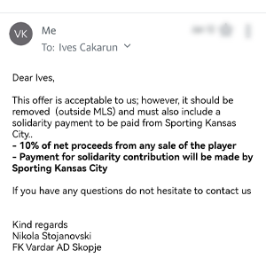 „ФК Вардар АД реши да ја прифати милонската понуда од екипата на Спортинг Канзас Сити од Канзас САД. Клуб што се натпреварува во најсилната MLS фудбалска лига во САД.