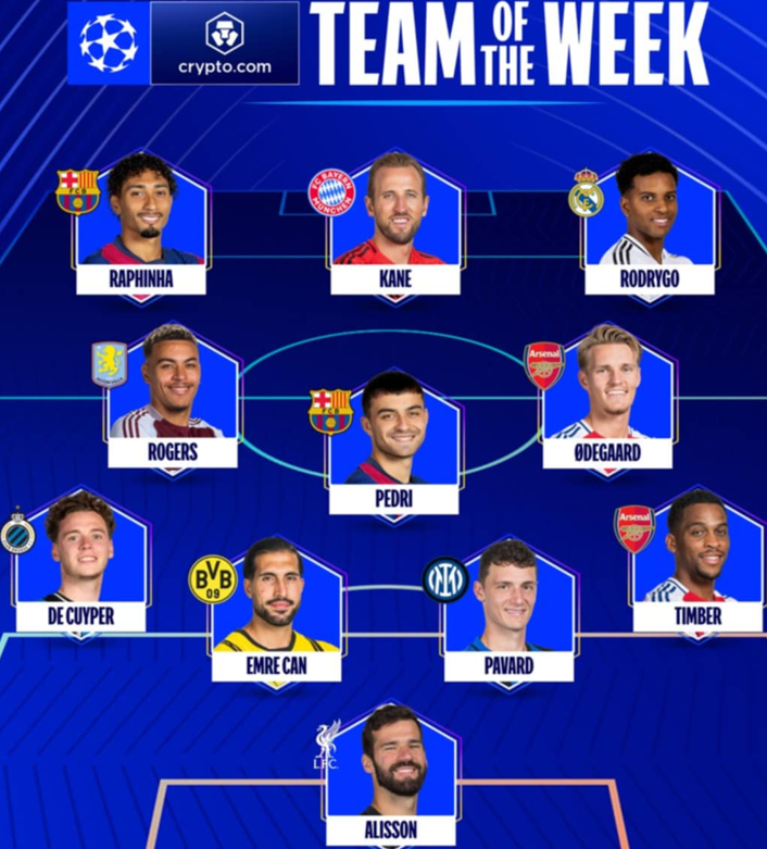 Средниот ред го сочинуваат: Роџерс, Педри и Одегард, а во нападот: Рафиња, Кејн и Родриго.