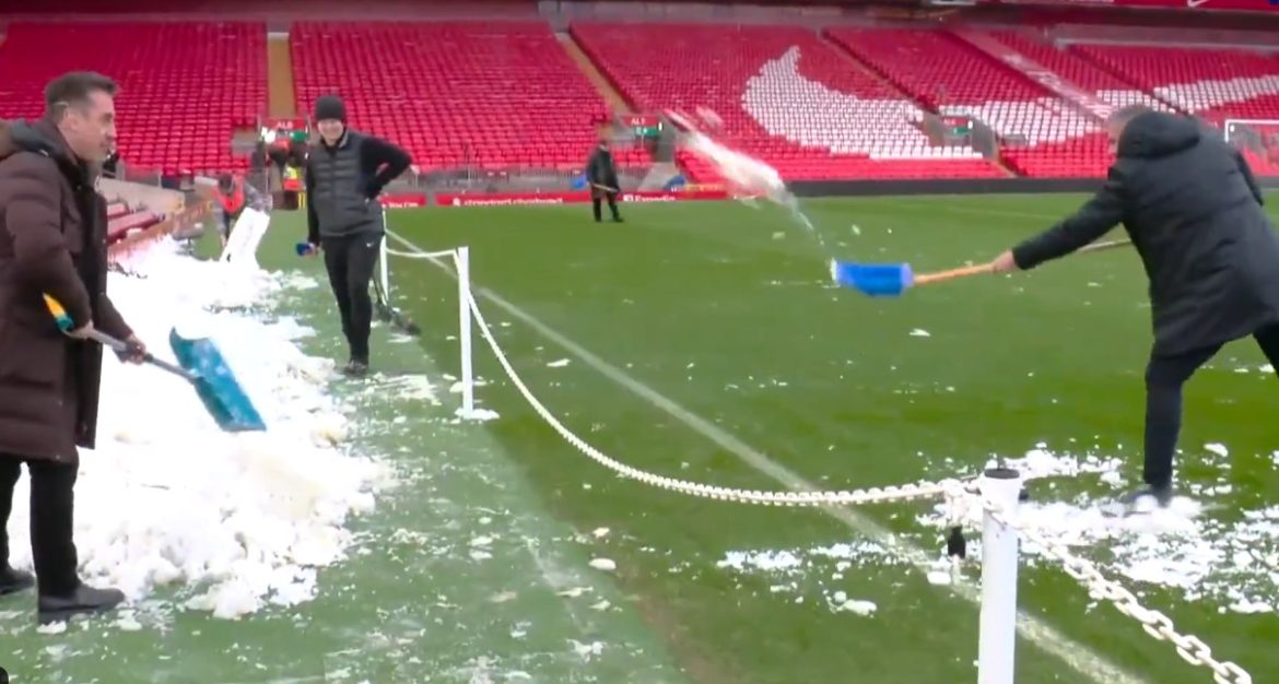 При чистењето на снегот од теренот во интересна ситуација беа забележани поранешните фудбалери Гери Невил и Џејми Карагер.