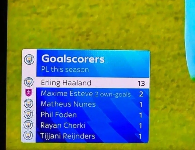 Интересен е податокот дека втор стрелец на тимот моментално е играч кој воопшто не настапува за „граѓаните“. Станува збор за фудбалерот на Барнли, Максим Естев, кој на меѓусебниот натпревар одигран на 27 септември си постигна два автогола, придонесувајќи Сити да слави убедливо со 5-1.