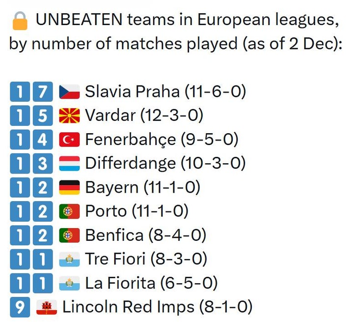На оваа листа избраниците на Гоце Седлоски се наоѓаат на второто меесто и повеќе натпревари без пораз има само Славија Прага која е на врвот со 17. Сепак, чешкиот тим има дури шест нерешени средби и 11 победи, па така вардарци во ова  друштво имаат најмногу триумфи.