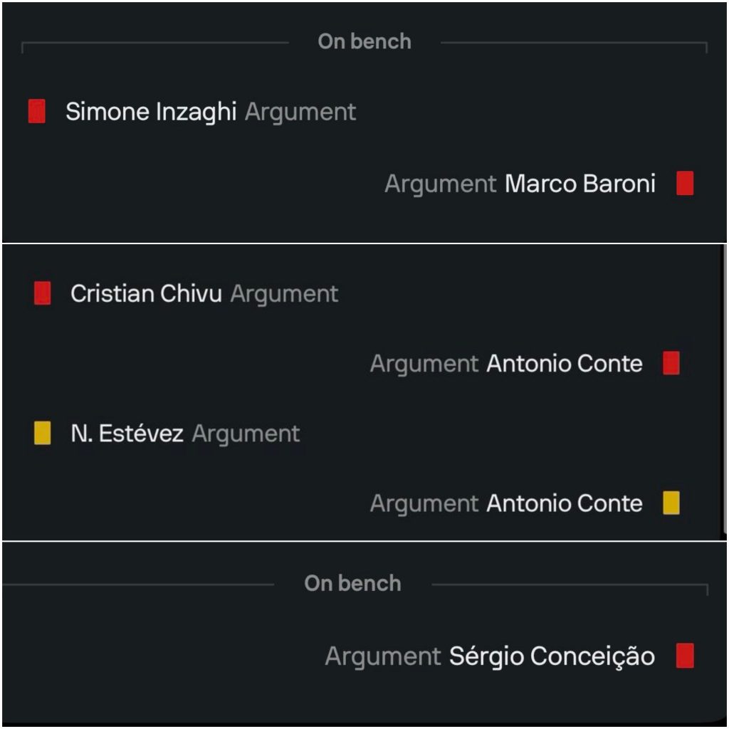 Прво беа исклучени Симоне Инзаги и Марко Барони на мечот меѓу Интер и Лацио, а брзо потоа се случи мешаница и на дуелот меѓу Парма и Наполи по која црвени добија Кристијан Киву и Антонио Конте.