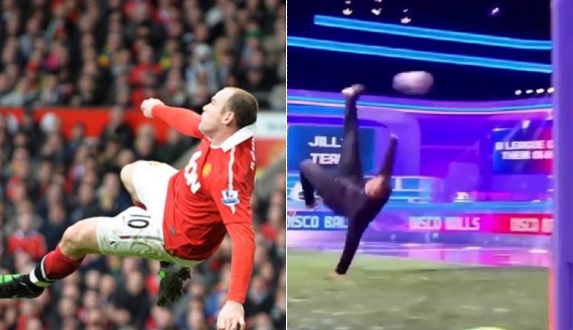 Вејн Руни повторно ги воодушеви и на неколку секунди се врати во минатото откако во една ТВ емисија се обиде да ги повтори акробатските ножички против Манчестер сити во 2011 година.