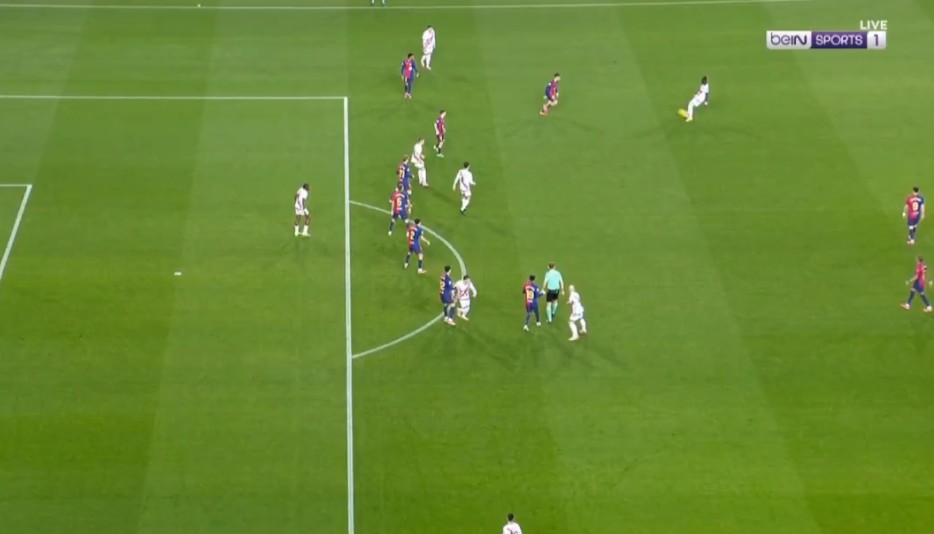 ▪️ El delantero francés bloquea a Íñigo Martínez e incluso le pone la pierna por delante para dificultar que llegue a De Frutos.