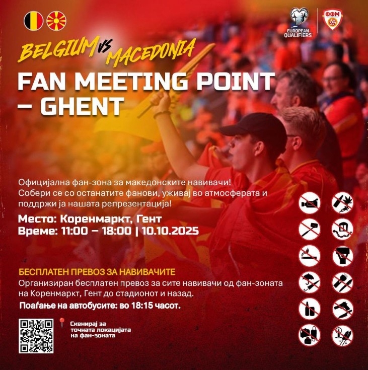 Фудбалската федерација на Македонија соопшти дека пред натпреварот со Белгија, кој ќе се одигра на 10 октомври во Гент, ќе биде организирана специјална фан-зона за македонските навивачи.