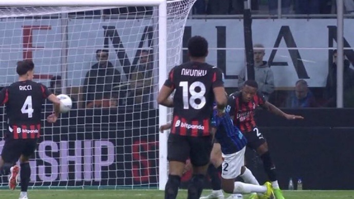 2. Играчот од средниот ред на Милан се обидува да ја повлече раката за да избегне контакт.